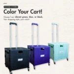 Dive into an unparalleled shopping experience with the HOUZE – Moveet Foldable Shopping Trolley in four colours. Meticulously constructed with sturdy ABS and lightweight aluminium. let this trolley be your dependable mate for every shopping spree. The captivating design and radiant green. black. purple. and pink hues will turn heads. while its swift 5-second assembly ensures you’re always on the move. Shed the strain of cumbersome bags and embrace an efficient shopping journey that exudes elegance. With Moveet. elevate not just your purchases but your entire shopping narrative. Shop smart. shop with flair. shop Moveet.