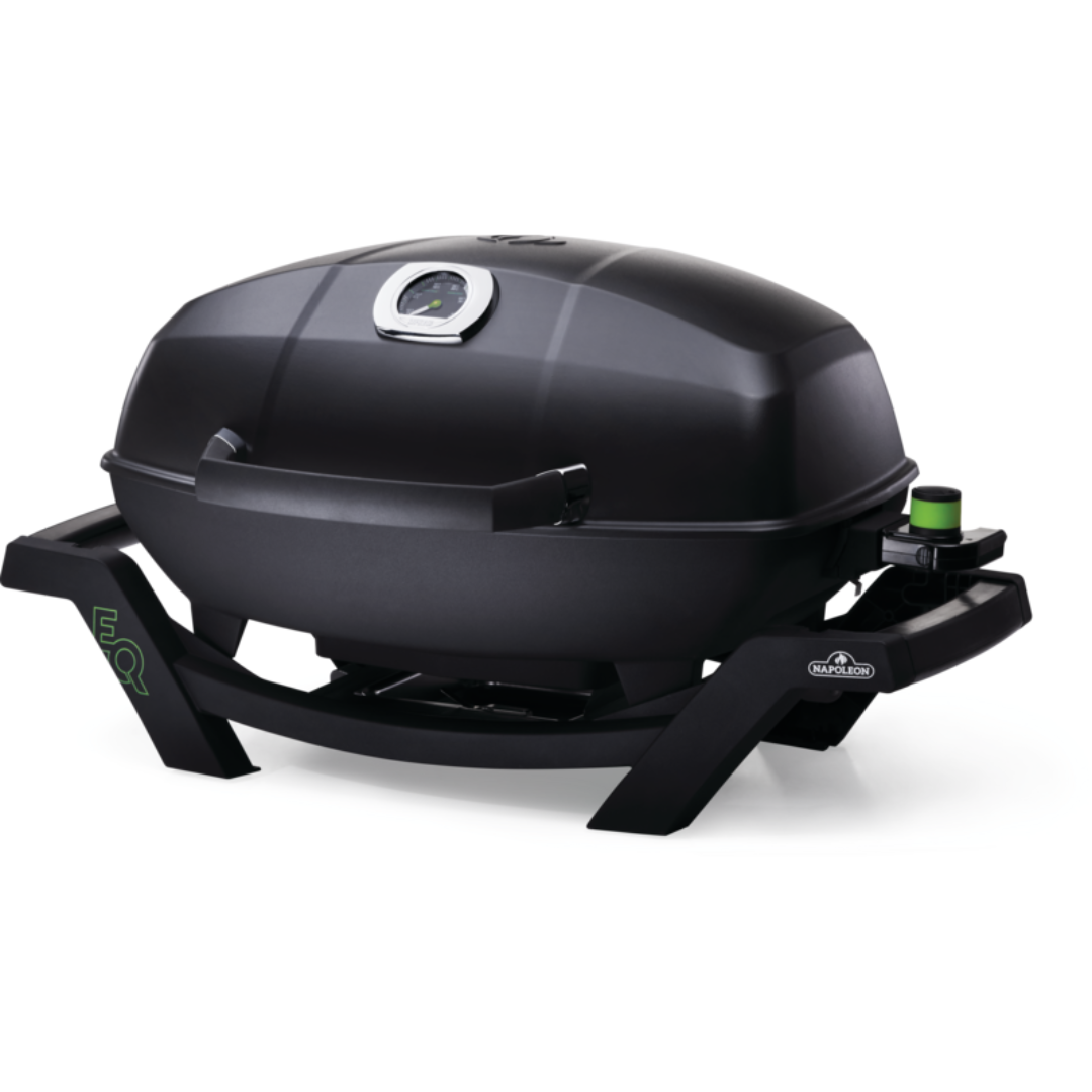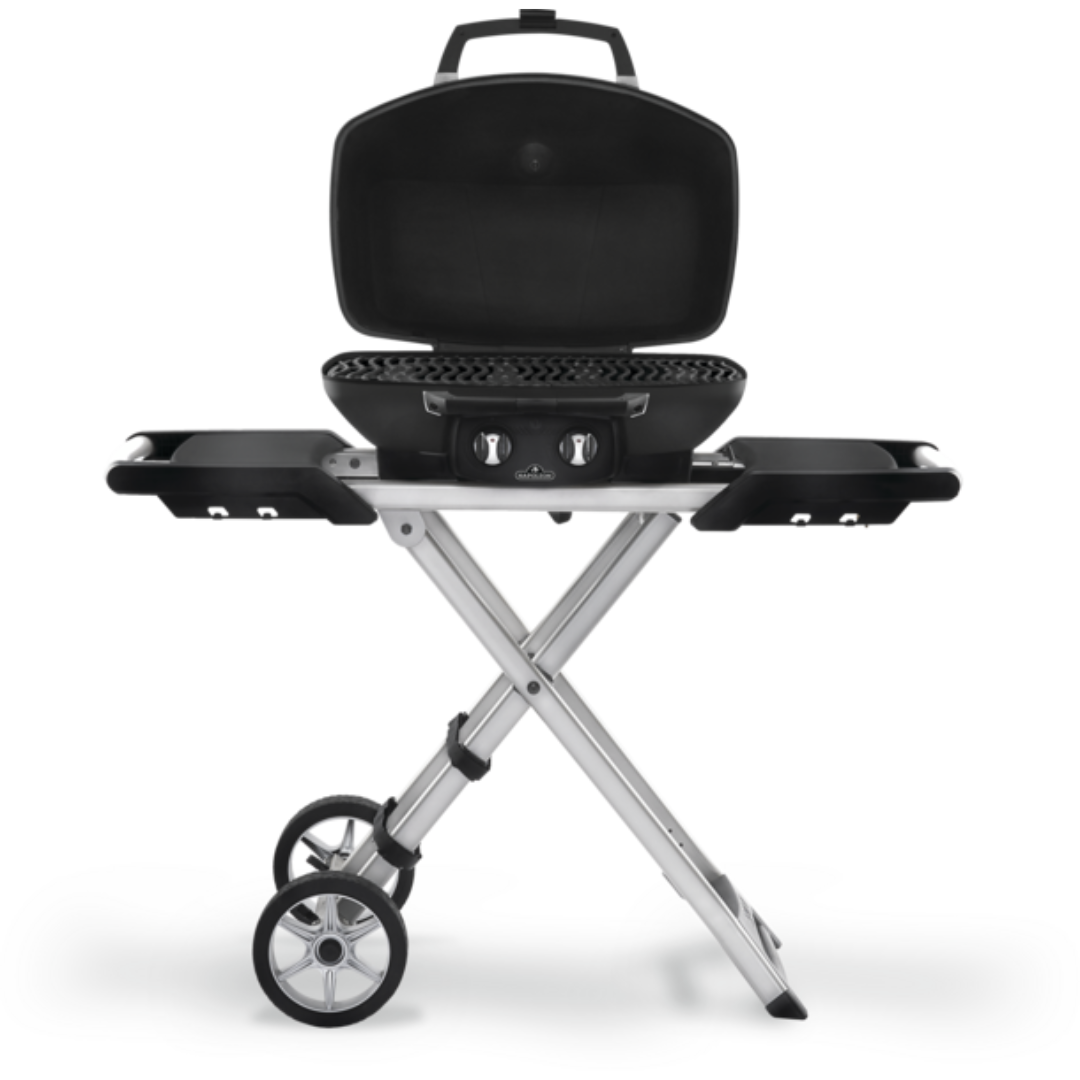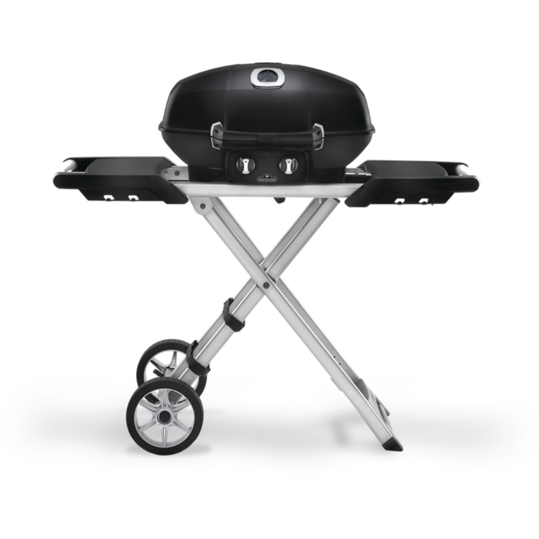 Napoleon’s TravelQ™ PRO285 Portable Propane Gas Grill can grill up to 20 hamburgers at once on the 285 square inches of cooking area. The stylish all-black finish with chrome details will match any outdoor decor. The cast aluminum. high-topped lid design lets you take portable grilling to the gourmet level. Roast whole chickens or turkeys. pork and even prime rib; this little grill can do it. Using the dual stainless steel burners. you have precise control over the temperature. just like on Napoleon’s full sized grills. High heat searing is a snap and you’ll know it’s a Napoleon with the iconic WAVE™ cooking grids for those distinctive sear marks. This grill has everything you need for perfect portable grilling anywhere. featuring all-terrain wheels. easy folding. setup. and compact storage. and propane tank straps. this grill is perfect for any adventure. You can’t beat this portable. professional package.
