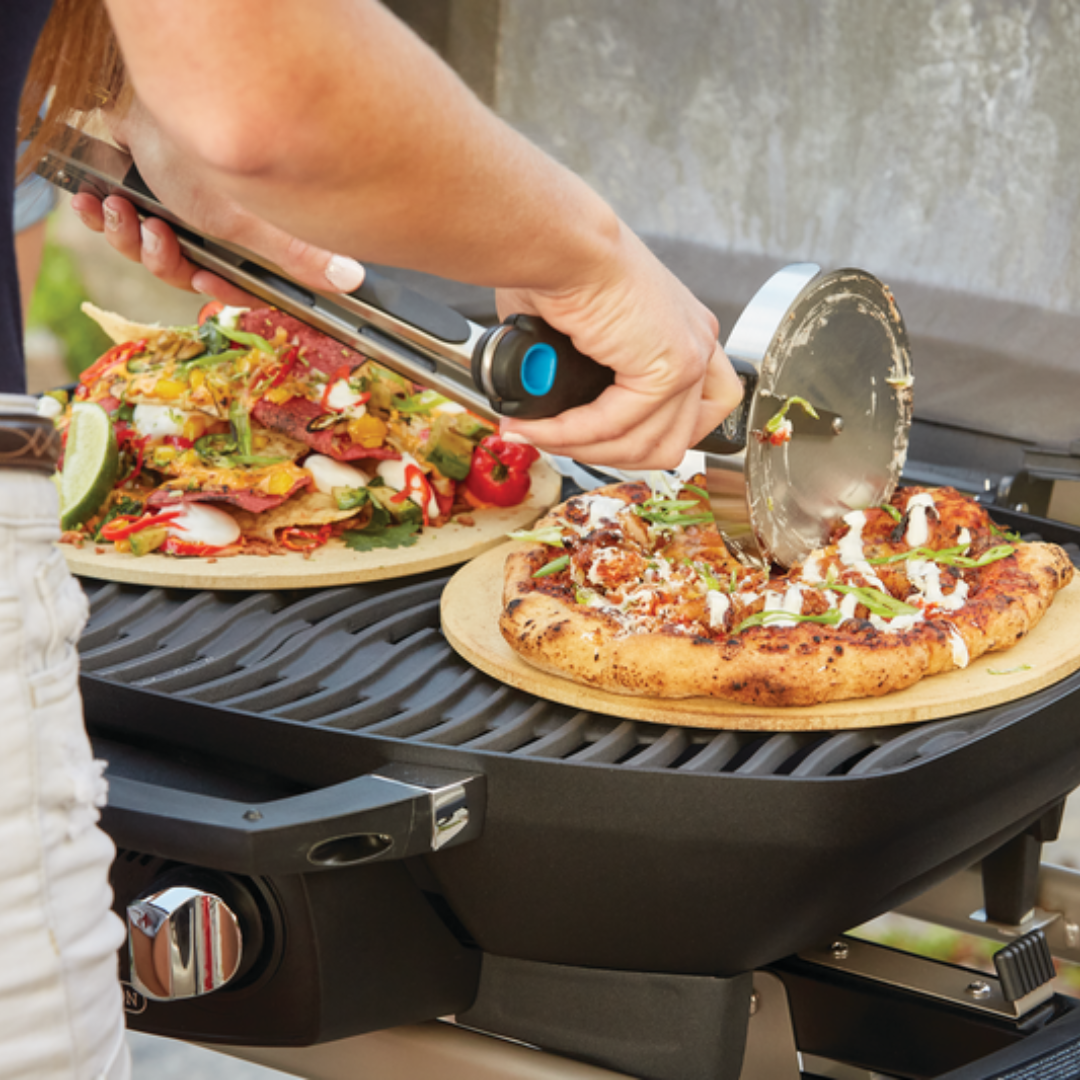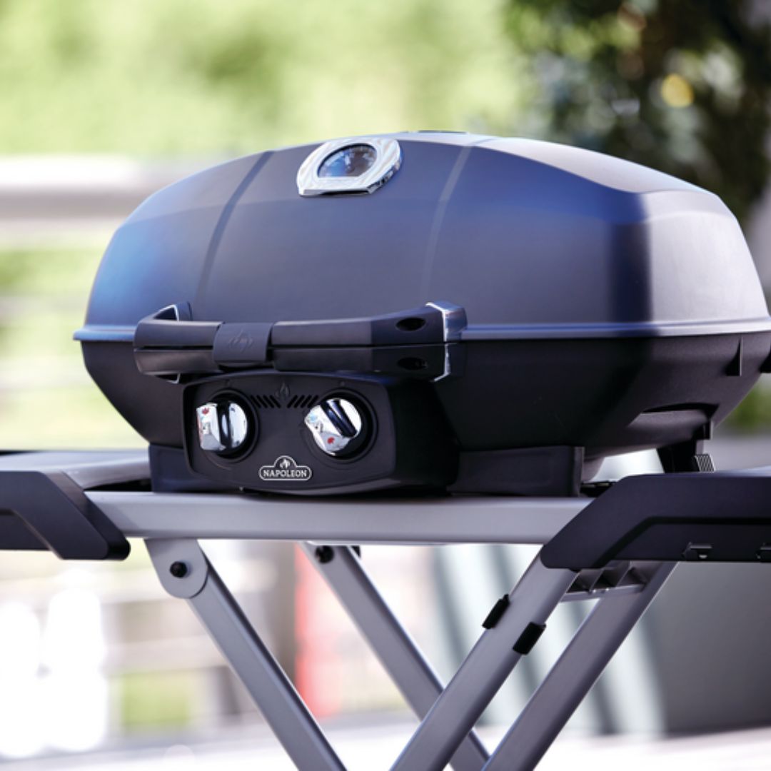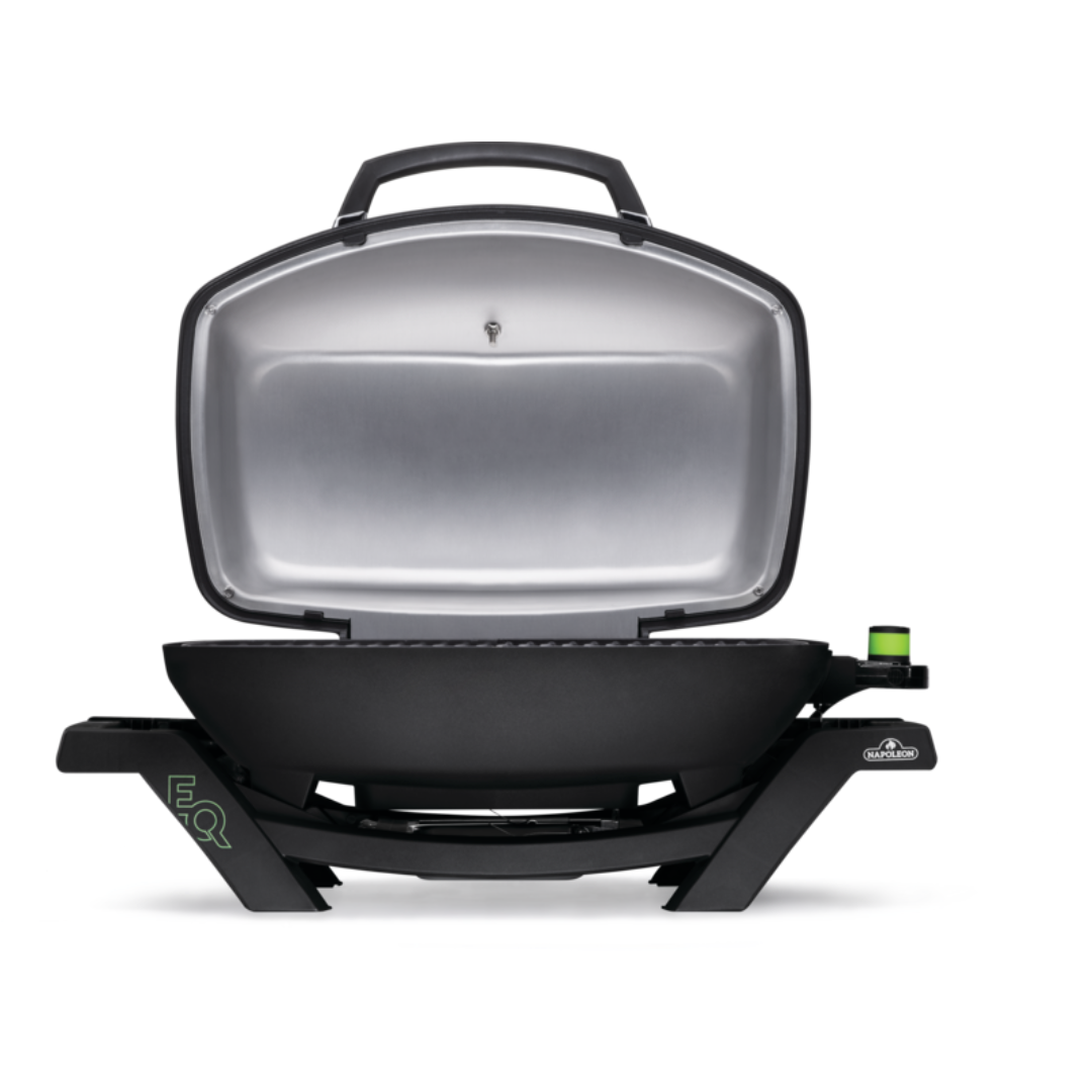 Napoleon’s TravelQ™ PRO285 Portable Propane Gas Grill can grill up to 20 hamburgers at once on the 285 square inches of cooking area. The stylish all-black finish with chrome details will match any outdoor decor. The cast aluminum. high-topped lid design lets you take portable grilling to the gourmet level. Roast whole chickens or turkeys. pork and even prime rib; this little grill can do it. Using the dual stainless steel burners. you have precise control over the temperature. just like on Napoleon’s full sized grills. High heat searing is a snap and you’ll know it’s a Napoleon with the iconic WAVE™ cooking grids for those distinctive sear marks. This grill has everything you need for perfect portable grilling anywhere. featuring all-terrain wheels. easy folding. setup. and compact storage. and propane tank straps. this grill is perfect for any adventure. You can’t beat this portable. professional package.